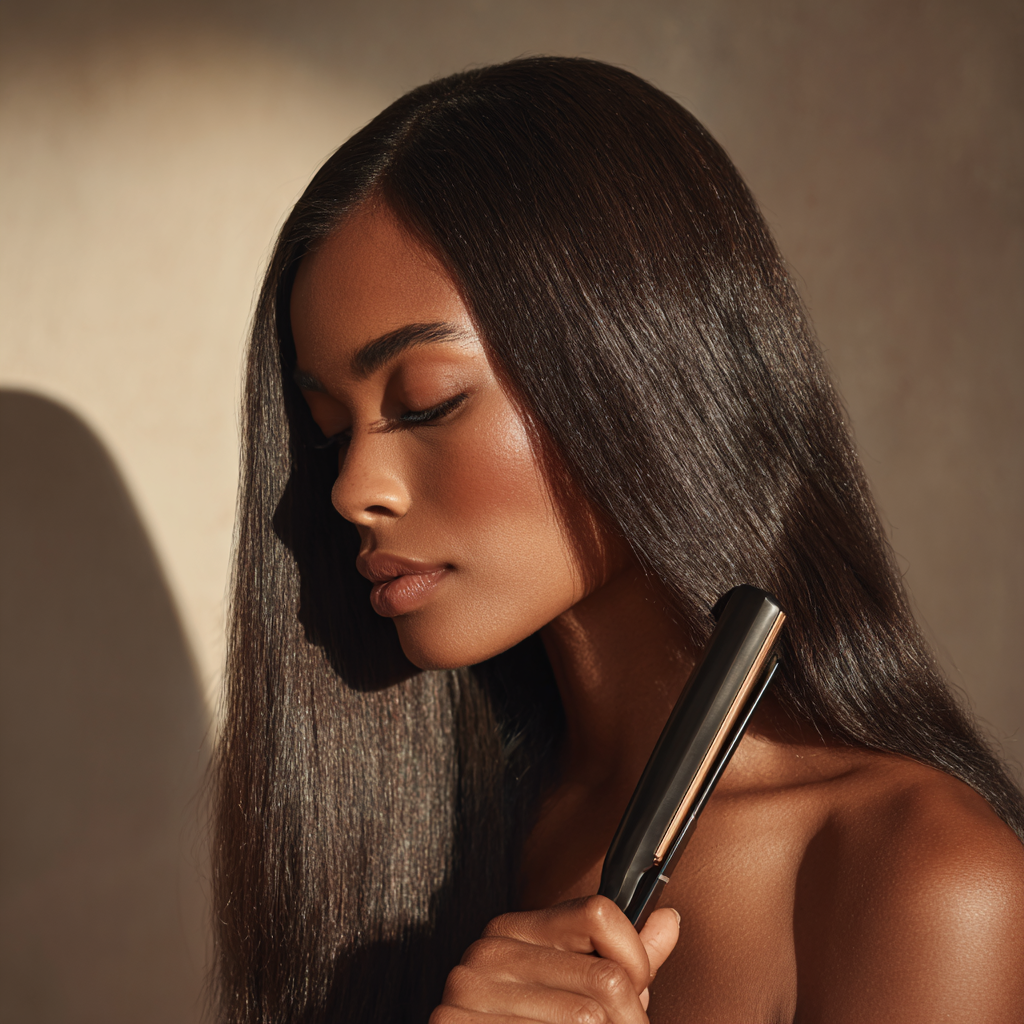 Finition salon : cheveux lissés, sans frisottis, avec un volume naturel et une texture soyeuse.